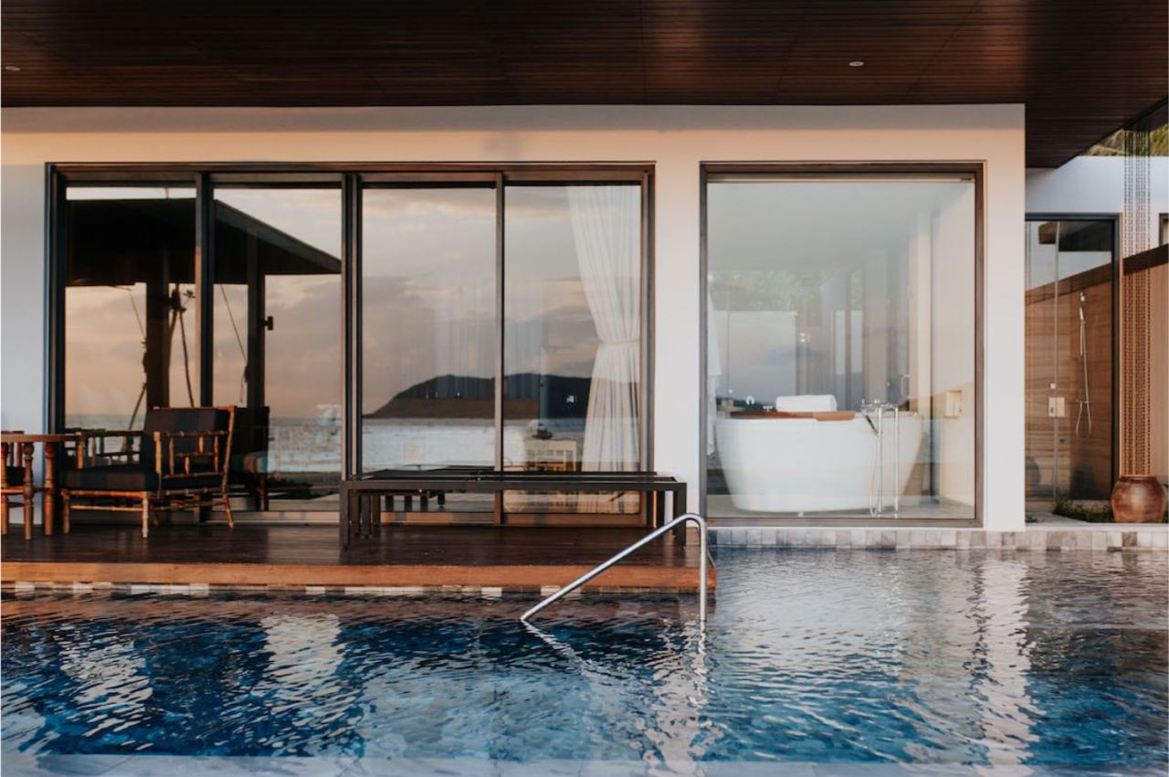There are two options for you: one-bedroom apartments right next to the ocean, and two-bedroom side-by-side apartments like ours up on the hill. Our family booked a two-bedroom apartment in December. The two bedrooms are not connected with separate entrances, ensuring guests’ privacy in each room. Opposite the bed is a transparent glass wall that captures the sea view in front of the house to the offshore islands. If you dare to “risk” showering with the curtains open, you can enjoy the same view. Each villa is equipped with an infinity pool and a terrace.