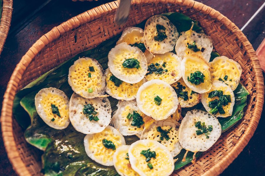 Banh can is a type of small rice pancake with various fillings such as shrimp, squid, quail eggs, pork, and more. They are cooked using special molds with small holes. Each hole is covered with a small clay lid during the cooking process, creating a unique texture – crispy on the outside and soft inside.