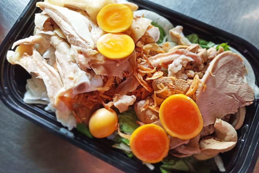 Banh uot long ga is a famous Dalat specialty. In many regions of Vietnam, BANH UOT is usually served with pork sausage, spring rolls, and fresh herbs. However, in Dalat, banh uot is served with shredded chicken and chicken innards. The chicken meat is firm, slightly chewy, and has a distinctive aroma. Various chicken innards like liver, gizzard, intestines, and stomach can win over most diners, including those who have never tried chicken innards before. Banh uot is served with shredded chicken, innards, fresh herbs, chili (optional), and a sweet and sour fish sauce.
