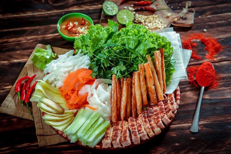 Nem nuong Dalat is made from finely ground selected pork, seasoned with minced garlic, and various spices following a traditional recipe. It’s then rolled in rice paper with lettuce, cucumber, banana flowers, and star fruit. The extraordinary feature is the dipping sauce, prepared with a mixture of sweet, sour, and spicy flavors, which is made from boiled pork bone broth, combined with soy sauce, roasted sesame, and additional seasonings.