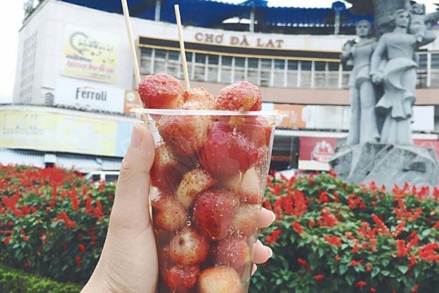 Strawberries are one of the most famous fruits in Dalat. You can visit some strawberry farms to pick fresh strawberries and buy them as souvenirs. However, if you want to try a simple yet famous snack, Strawberry shake, the best place to get it is the Dalat night market. Basically, it’s just sliced strawberries, dusted with sugar, salt, chili, and sometimes condensed milk, all shaken together. It’s an interesting experience to enjoy Strawberry shake while walking around the market.
