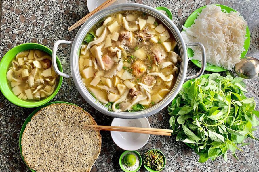 Lau ga la e, with its unique flavor and aroma from the elephant ear leaves found only in Đà Lạt, is the hallmark of this dish. The leaves provide an impressive scent, slightly sour and a bit bitter.